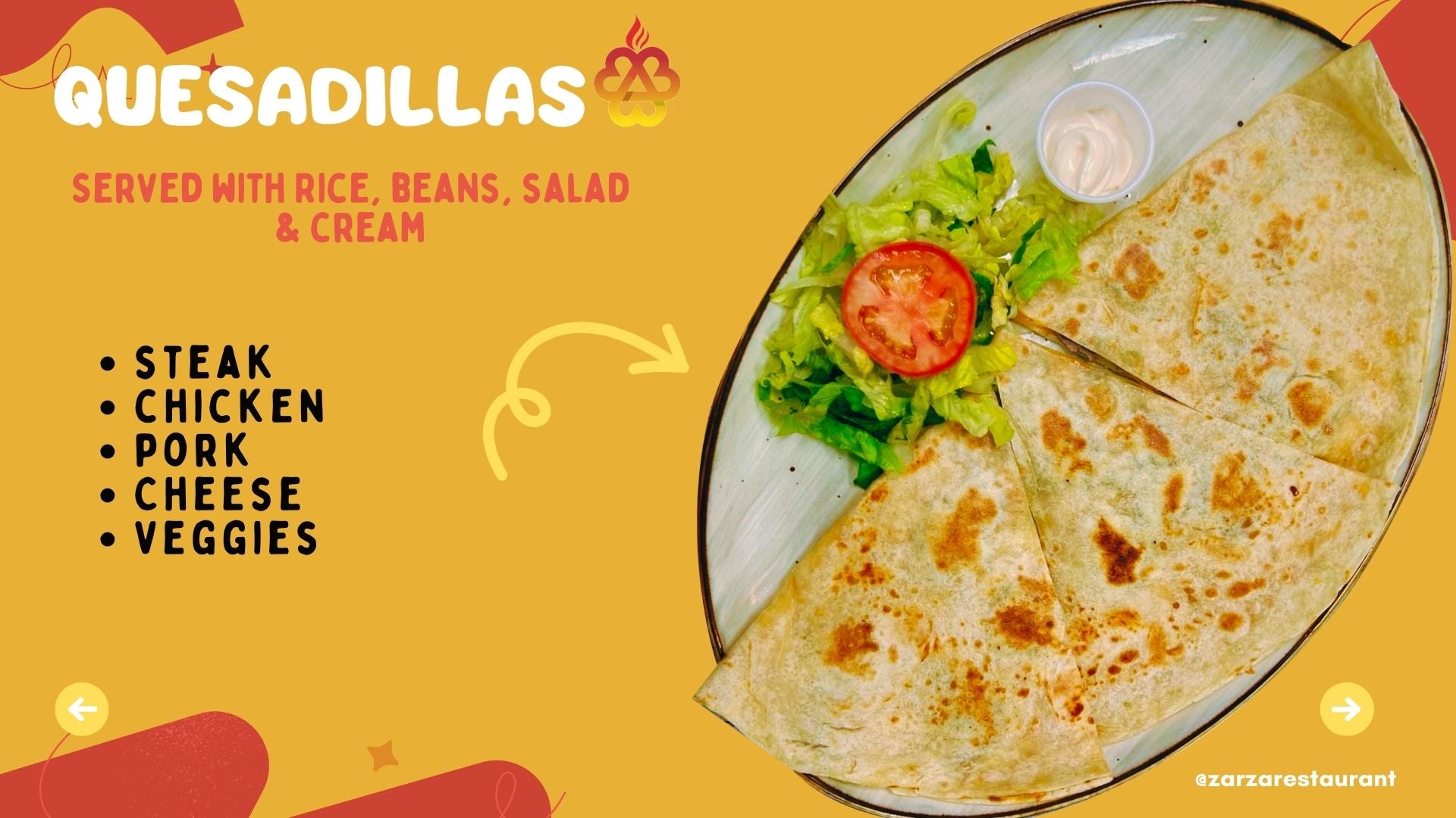 Indulge in the savory goodness of our Steak, Chicken, or Pork Quesadillas. Each one is a symphony of flavors, featuring succulent meats enveloped in a warm tortilla, generously layered with melted cheese. Served with a side of fluffy rice, hearty beans, crisp salad, and a dollop of creamy goodness, our Quesadillas promise a delightful fusion of Mexican and Latin culinary delights.